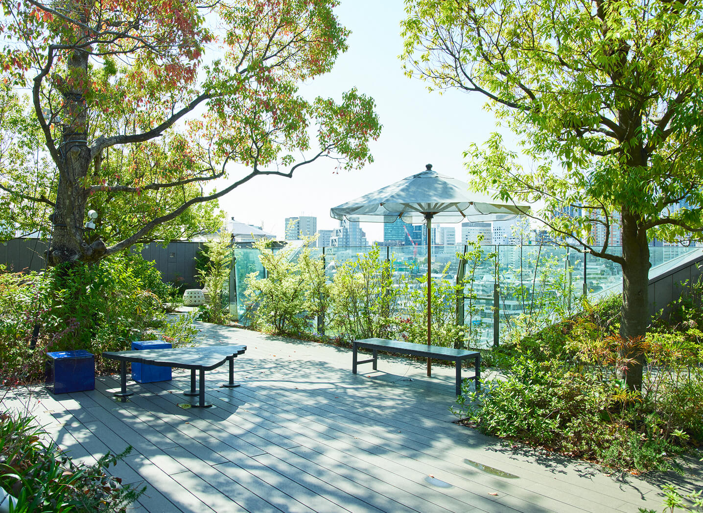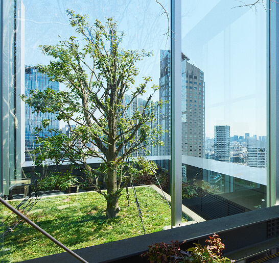 渋谷駅に隣接する複合施設。みどり豊かな広場を設け、屋上、壁面なども活⽤した立体的な緑化を進めています。