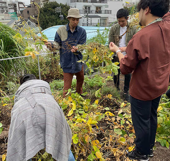 TENOHA棟では、生物多様性について学べるワークショップを開催しています。1Fカフェでは屋上菜園で育てた野菜のメニューを提供。