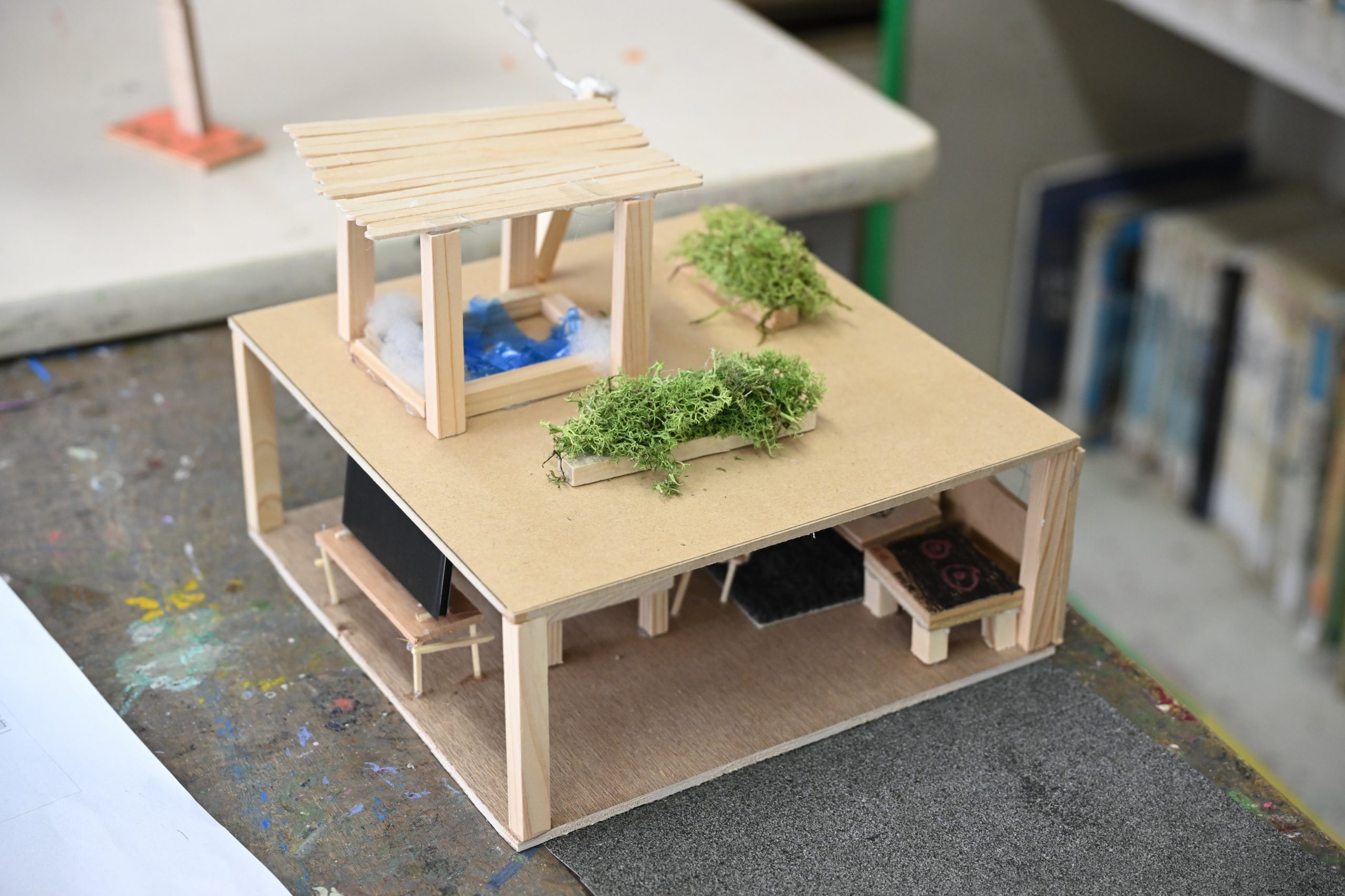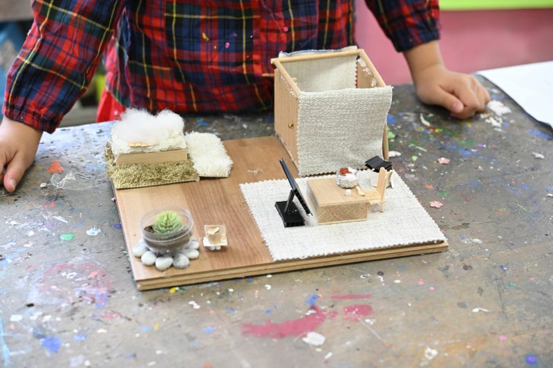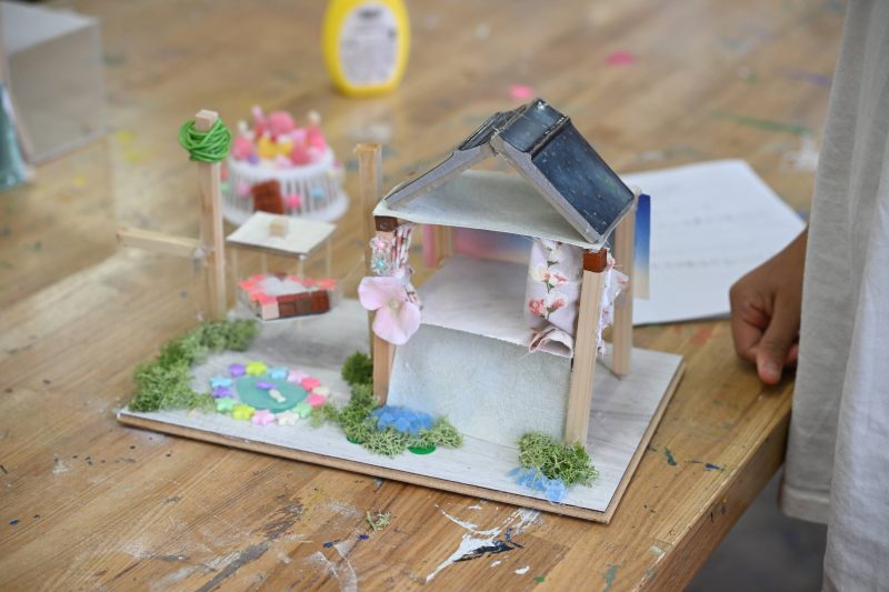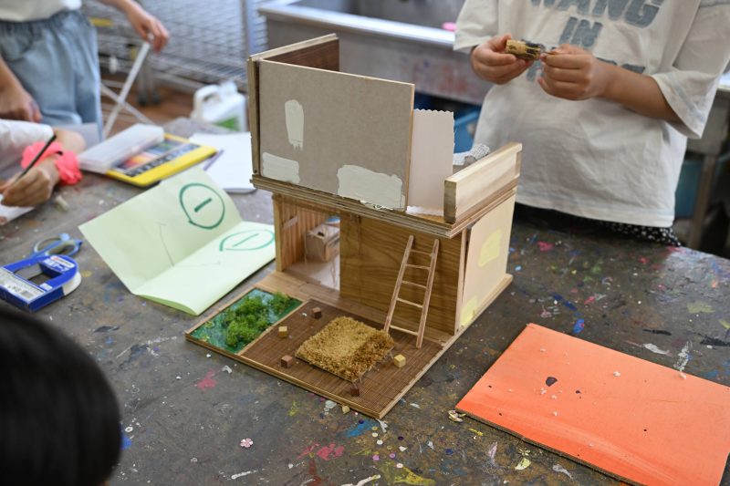 その後の図工の時間では、今回の授業のテーマである「まだ見ぬ建物」の模型づくりにチャレンジ。何をつくるか悩む子は少なく、アイデアが次々と浮かんでいるようです。屋上に木を植えたり、ソーラーパネルを乗せたり、それぞれ工夫を重ねて作品を仕上げていきました。また、工作に夢中になりながらも友だちと相談したり、助け合ったりする様子も見られました。