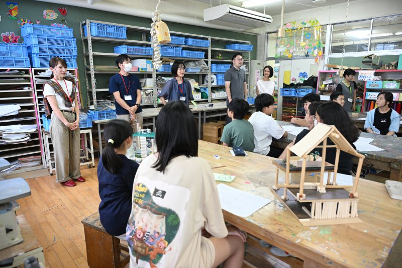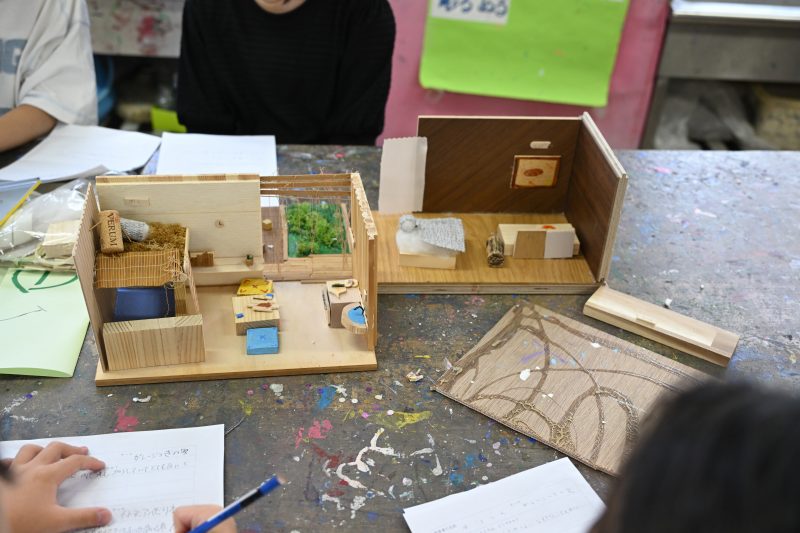 授業のテーマは「まだ見ぬ建物」。子どもたち自身が「建築家」となり、「こんな家があったらいいな」「まちの中にもこんな自然がほしい」といったアイデアを発表したり、模型づくりに取り組みます。