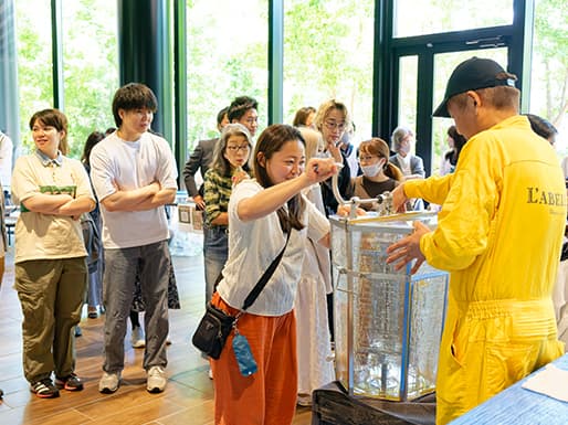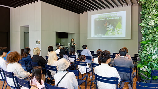 イベント当日は東急不動産のオフィスビルを利用するテナント企業から約50名が参加。講義で生物多様性や都市養蜂の意義を知っていただいた後、テラスに移動してハチミツの収穫を体験していただきました。