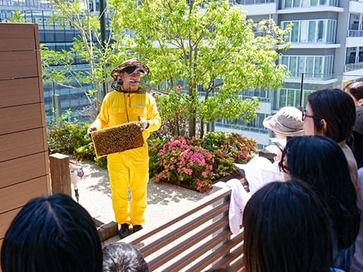 こうした背景を踏まえ、東急不動産は渋谷広域圏のオフィスビルや複合施設の屋上庭園、緑化スペースにセイヨウミツバチの巣箱を設置し、都市養蜂に取り組んでいます。また、今年5月には東京ポートシティ竹芝(東京都港区)の5階テラススペースで、ハチミツの収穫を体験できるイベントを開きました。