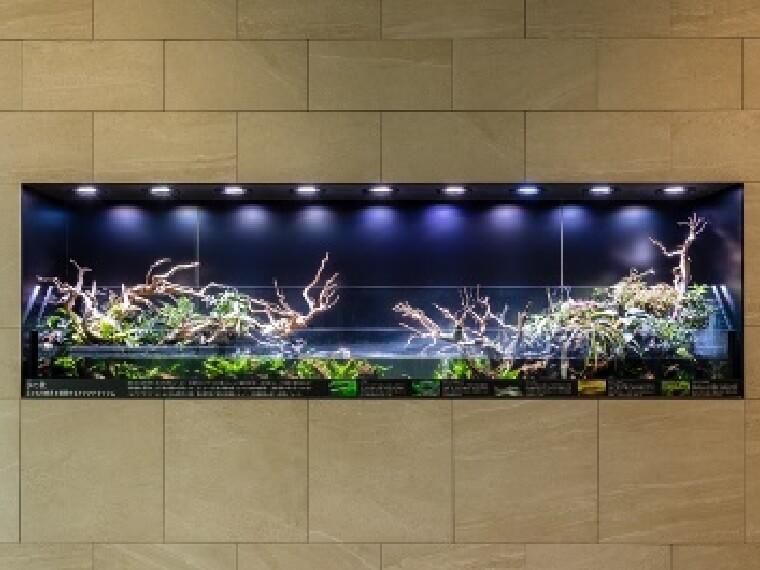 その1つである3階の「水の景」には、小さな生態系を表現するアクアテラリウムを設置。水槽にはヤマトヌマエビ、シマドジョウ、メダカといった多摩川中流域に生息する在来種と一緒に、ヨシノボリが元気に泳いでいます。
