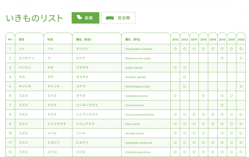 2012年以降、「おもはらの森」で確認できたいきものの数は、鳥類22種、昆虫類158種。都市で暮らす多種多様ないきものたちのなかには、私たちの身近な環境で、したたかにたくましく生きるハシブトガラスの姿も見ることができます。